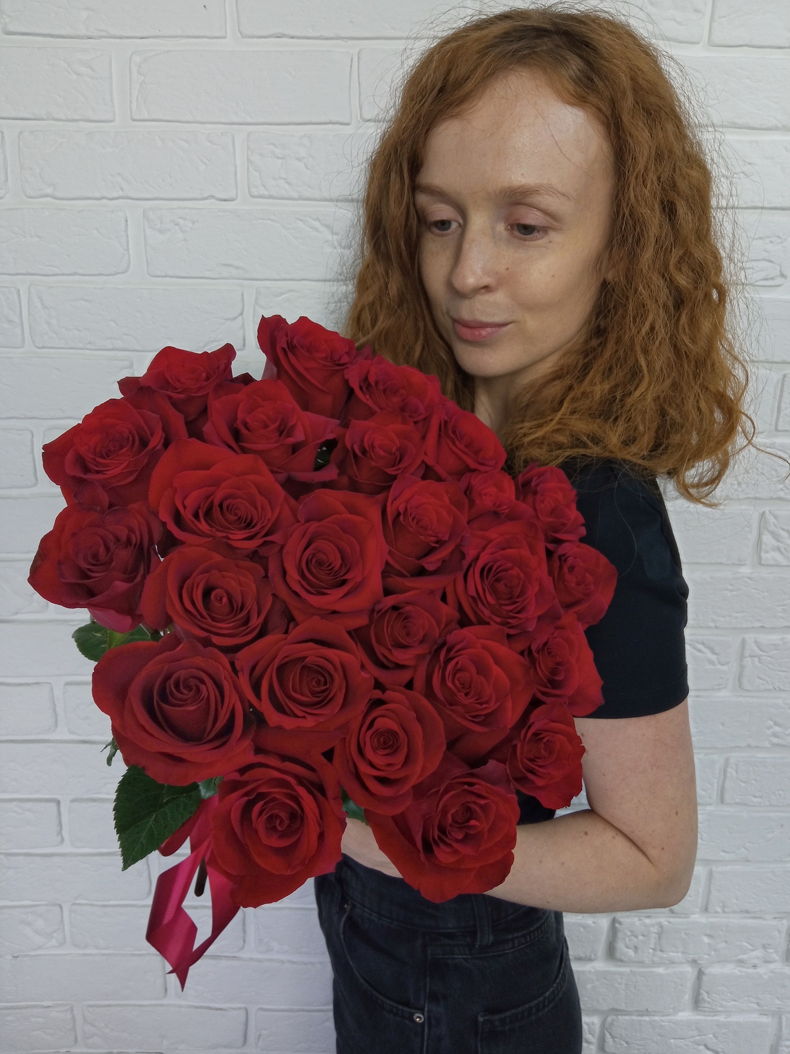 Специальное предложение - уникальная цена на элегантный букет из 25 роз 50 см с атласной лентой.