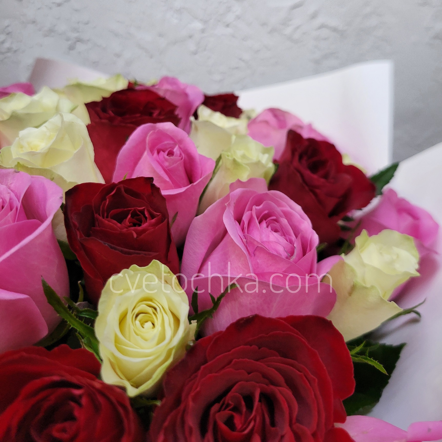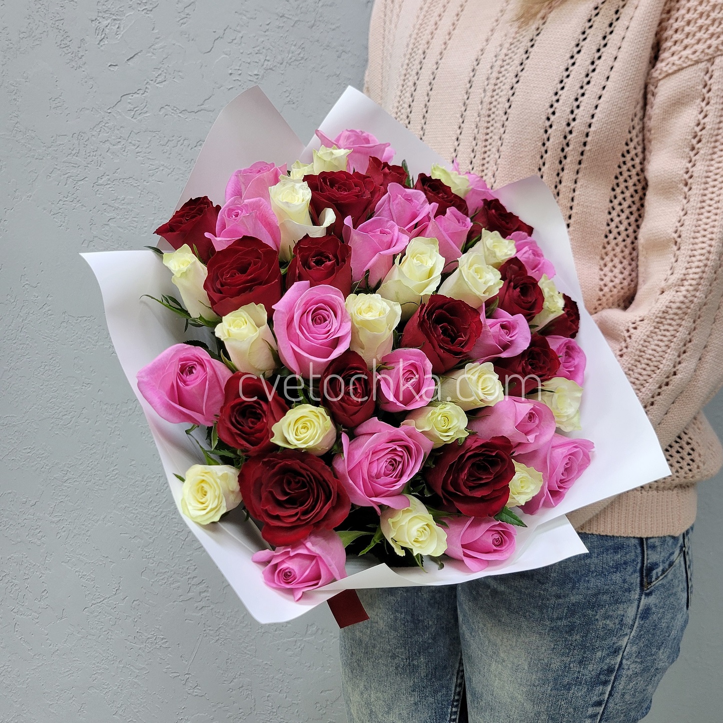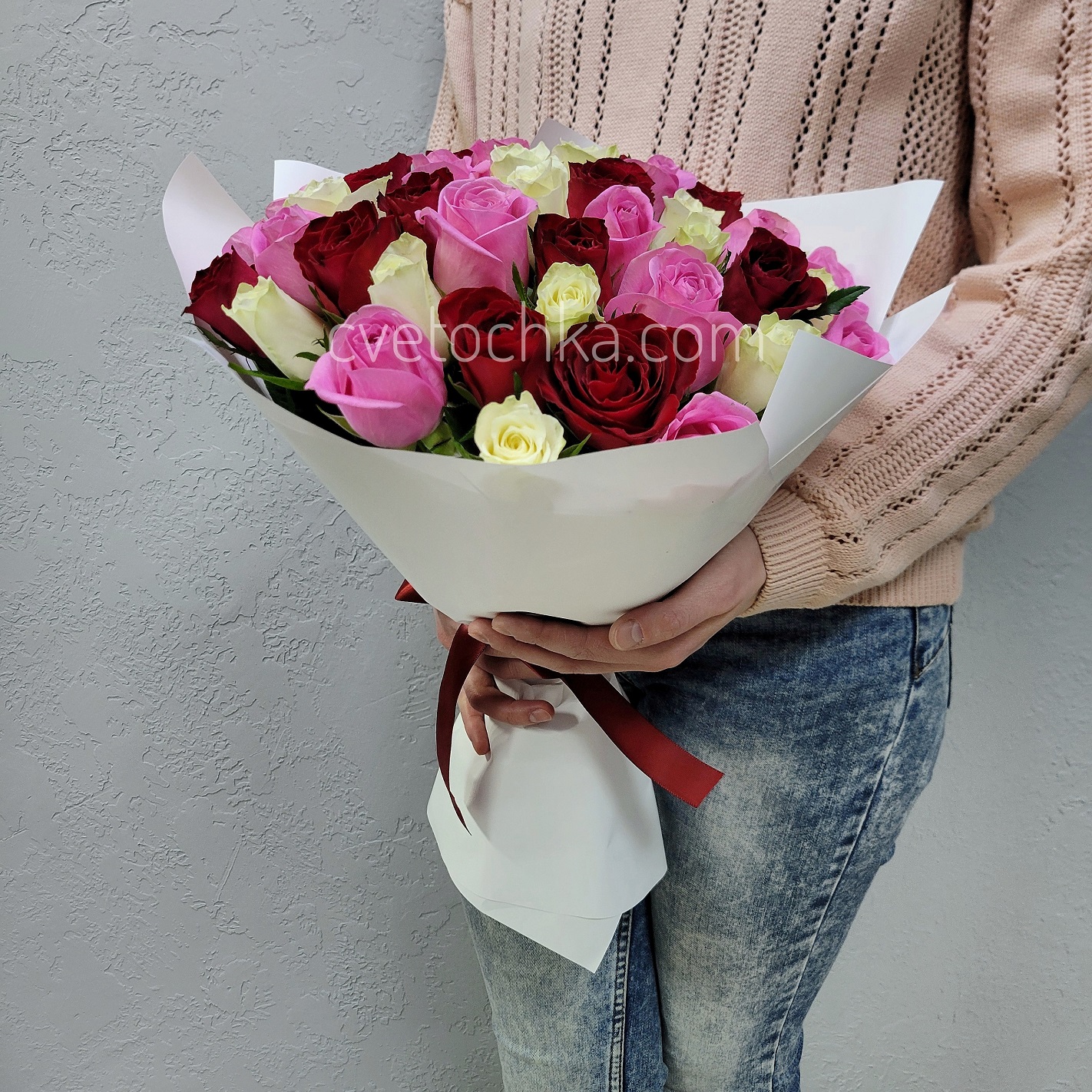 Цвет роз - на Ваш выбор из наличия. Наличие расцветок менеджер предложит при подтверждении заказа или уточняйте заранее написать в Telegram