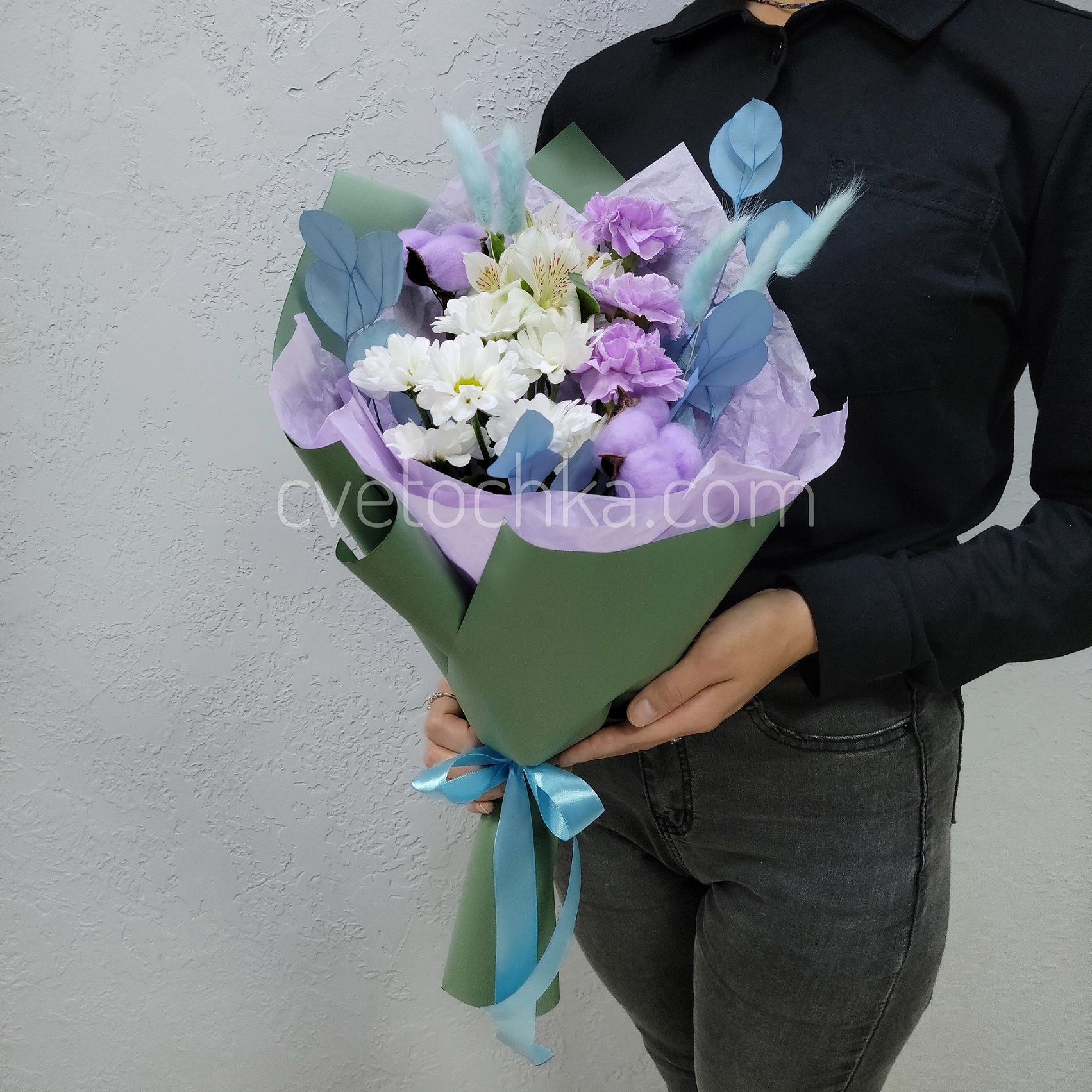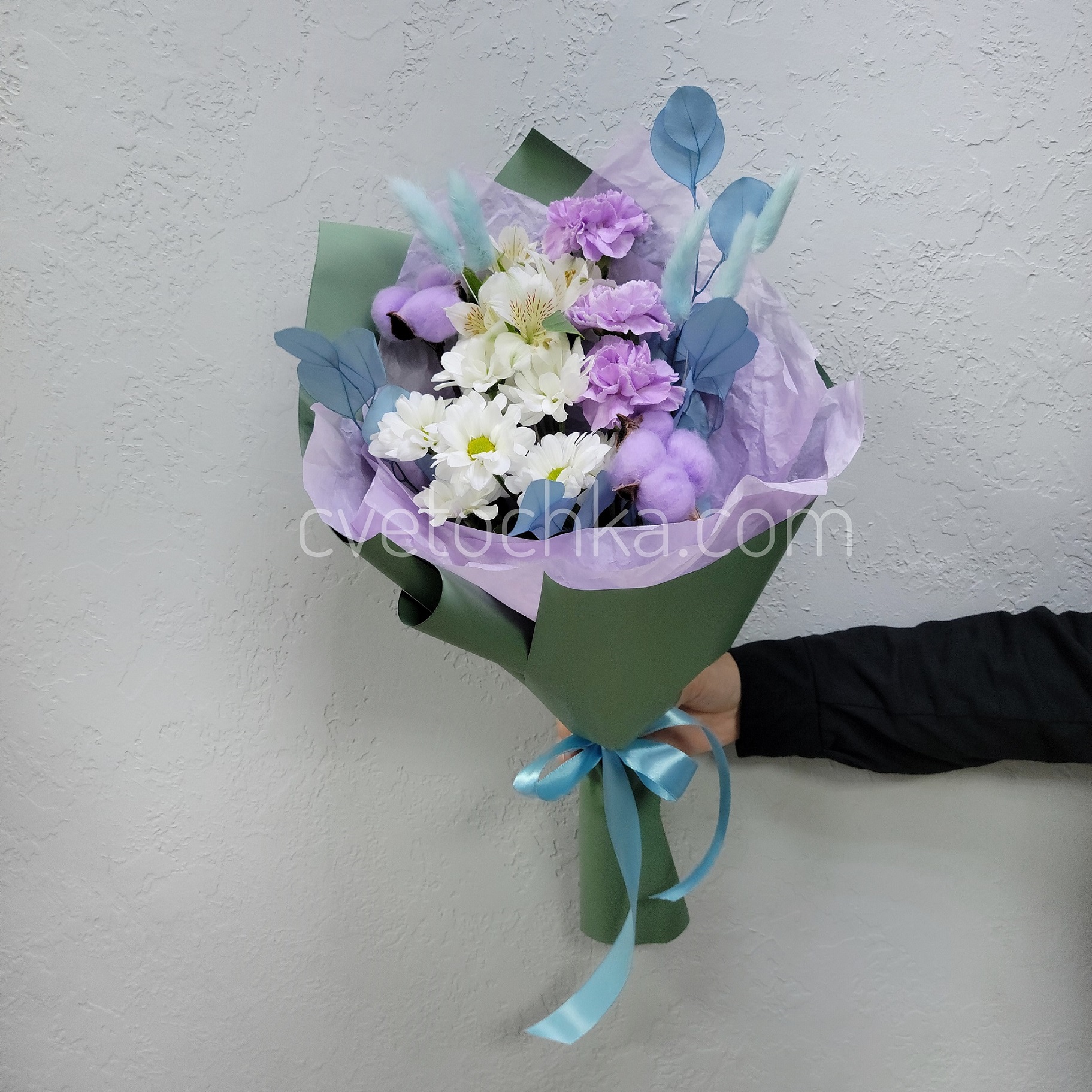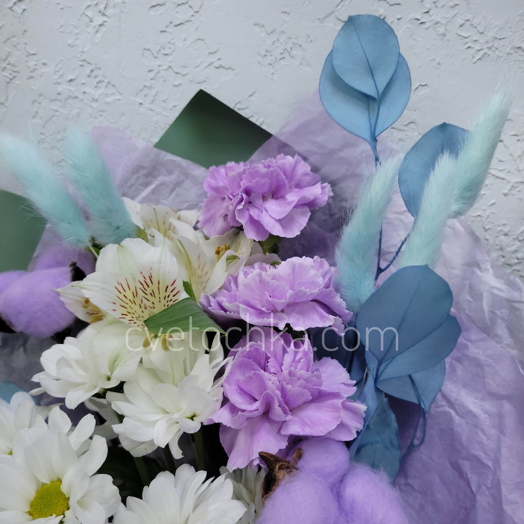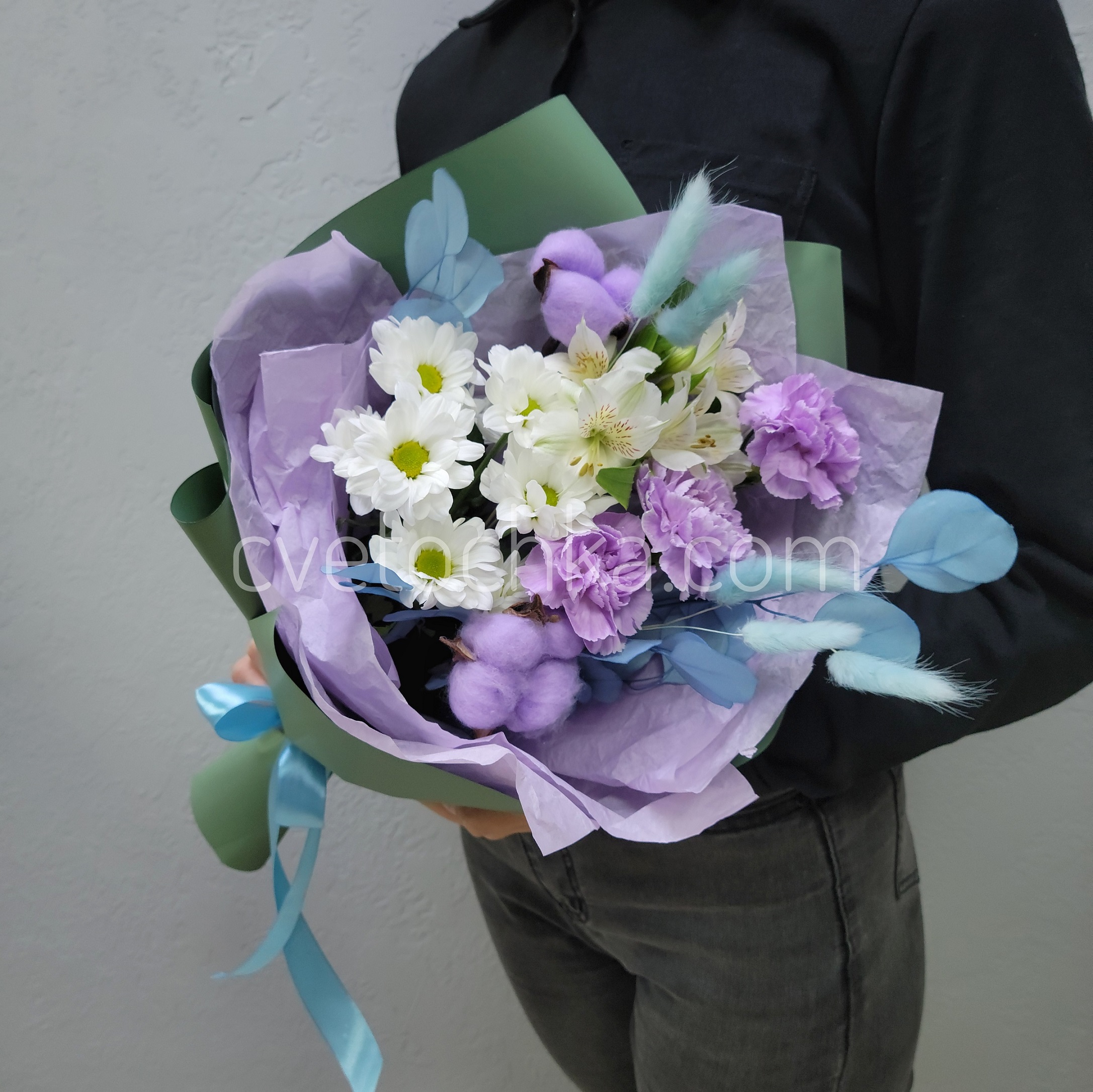 Вы можете купить букет в бело-сиреневой гамме с лунными гвоздиками с доставкой в Магнитогорске или оформить самовывоз из любого нашего магазина.